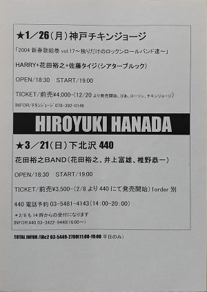 | ・HARRY/花田裕之/佐藤タイジ 2004.1.26 神戸チキンジョージ ・花田裕之BAND 2004.3.21 下北沢440 |