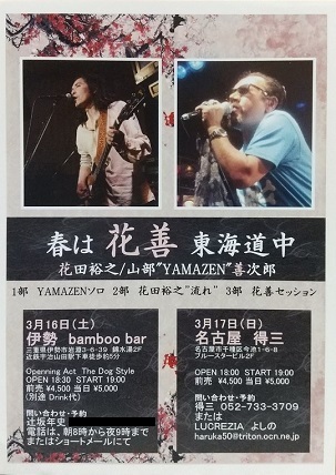 ・花田裕之 / 山部"YAMAZEN"善次郎 3.16 伊勢 bamboo bar / 3.17 名古屋 得三 |