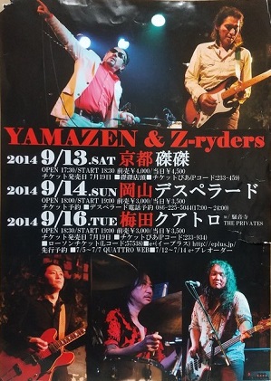 ・YAMAZEN & Z-ryders 2014.9.13 京都磔磔 / 9.14 岡山デスペラード / 9.16 梅田クアトロ (提供:ドクターパイレーツさん。ありがとうございます) |