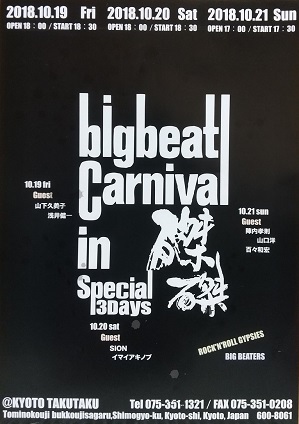 | ・「BIGBEAT CARNIVAL IN 磔磔 SPECIAL 3DAYS」 2018.10.19 & 20 & 21 京都磔磔 |