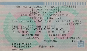 | 花田裕之 & ROCK'N' ROLL GYPSIES 1996.7.29 渋谷CLUB QUATTRO (花田裕之:VO,G/下山淳:G/井上富雄:B/池畑潤二:D/KYON:K,G/藤井康一:SAX,HARP) 01.Free Bird 02.街の生活はせちがらいなあと思っている男の唄 03.OOH LA LA(夕日に染まるまで) 04.鉄橋の下で 05.ケンとメリー~愛と風のように~ 06.HONEY MAKER 07.Sadness City 08.Mystery 09.Beginning 10.エレクトリック・マッド 11.(Instrumental) 12.Open Your Eyes 13.Drive All Night 14.Love Hurt 15.夢中で 16.風が吹いてきた (アンコール-1) 17.田舎者 18.You're So Free (アンコール-2) 19.On The Road Again (情報提供:yamadaさん) |