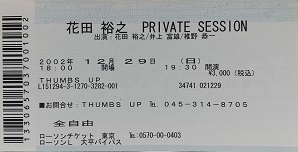 | 花田裕之PRIVATE SESSION 2002.12.29 横浜THUMBS UP (花田裕之、井上富雄、椎野恭一) 01.TALIKN' 'BOUT YOU 02.LONESOME TRAIN 03.DON'T BLAME ME 04.道のはて 05.風の中に消えた 06.LAST TRAIN 07.田舎者 08.LITTLE RED ROOSTER 09.みちくさ 10.CINNAMON GIRL 11.ふっと一息 12.なまずの唄 (アンコール1) 13.BABY WHAT YOU WANT ME TO DO 14.ひとつ (アンコール2) 15.誰かおいらに 16.GOT MY MOJO WORKING (情報提供:kazuyaさん) |