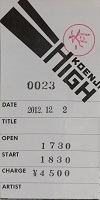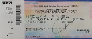 | band HANADA・'12/03/02 下北沢Daisy Bar 01.WALKING THE DOG 02.ひとつ 03.見はなされた夜 04.DON'T CRY NO TEARS 05.LAST TRAIN 06.BACK SEAT 07.路地裏のブルース 08.シルクの夜 09.お願いひとつ 10.LADY COOL 11.SADNESS CITY (アンコール1) 12.LITTLE QUEENIE 13.FREE |