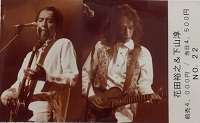 | 花田裕之 with 椎野恭一・'12 3/10 西麻布 新世界 (第一部) 01.AFTER THE MIDNIGHT 02.CRAZY LOVE 03.carry away 04.way out 05.月が見ていた 06.ASK ME NO QUESTIONS 07.LOVE IN VAIN (第二部) 08.CALL ME THE BREEZE 09.道の果て 10.back seat 11.ハイウェイをおりて 12.一人 13.待ちつづけ 14.シルクの夜 15.BABY WHAT YOU WANT ME TO DO~気をつけろ~FLY 16.freewheelin' (アンコール) 17.LITTLE QUEENIE 18.rollin' on (M-7、M15-18 with Chihana) |