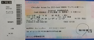 | band HANADA・'12/11/25 下北沢DAISY BAR 01.見はなされた夜 02.ひとつ 03.DON'T CRY NO TEARS 04.田舎者 05.LADY COOL 06.夢の旅路 07.シルクの夜 08.お願いひとつ 09.SADNESS CITY (アンコール) 10.LITTLE QUEENIE 11.ROLLIN' ON |