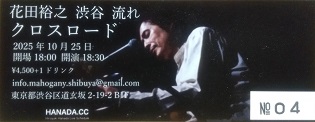 | 花田裕之「流れ」2025.10.25 渋谷CROSSROAD (第1部) 01.風の中に消えた 02.DOWN DOWN 03.汽笛が(山口富士夫) 04.時は流れて(柳ジョージ) 05.MY MY, HEY HEY(OUT OF THE BLUE)(NEIL YOUNG) 06.ロックンロール・ジプシーのバラッド 07.魅惑の宵(サンハウス) (第2部) 08.いつか見た夢 09.夢見るボロ人形(サンハウス) 10.SADNESS CITY 11.汽車はただ駅を過ぎる 12.花・太陽・雨(PYG) 13.祭り囃子が聞こえるのテーマ(柳ジョージ) 14.UNHAPPY GIRL (アンコール) 15.泣くだけ泣いたら(萩原健一) 16.にわか~雨(サンハウス) |
