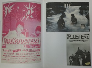 THE ROOSTERZ magazine (September 1st 1987) ・これはどのように入手したのかすっかり忘れていたが、中身を 読んで思い出した。当時はアナログからCDへの転換期で(私 がルースターズをCDで購入したのは「PASSENGER」から)、 ルースターズの初期のアルバムはまだCD化されていなかった のだが、この時期に初めてまとめてCD化された。 それで中の広告に「9/1発売のCD6タイトルを2枚お買い上げ の方に抽選でルースターズ・マガジンをプレゼント」と書いて あるので、私も当時2枚以上買って当てたんだと思う。 ・20ページ。2色印刷で写真はモノクロ。内容はパリレコー ディングのリポートがメイン。パリの写真多し。 縦33.5センチ、横24.5センチとけっこう大きく、わりと置き 場所に困る(笑)。 |
