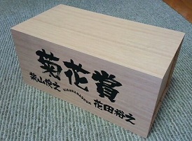 「リハーサル音源集CD-R」 01. 旅姿三人男 02. 京都慕情 03. 雨の御堂筋 04. 王将 05. 激しい恋 06. 祇園小唄 07. 道頓堀行進曲 08. そして神戸 09. 逢いたくて逢いたくて 10. 遠くへ行きたい 11. 霧笛が俺を呼んでいる 12. 侍ニッポン 13. さすらい 14. 恋の山手線 15. なごり雪 16. わたしの城下町 17. 長崎物語 18. 砂に書いたラブレター 19. ドッグ・オブ・ザ・ベイ 20. ハロー・アイ・ラブ・ユー 21. 上海帰りのリル 「博多百年蔵ライヴ映像DVD-R」 01. ロックンロールの真最中 ~Rock A Hula Baby ~あの娘は18才 ~ロックンロールの真最中 02. Louisiana Mama 03. なまずのうた 04. ふるさとのない人達 ・菊花賞のアルバム全25枚を購入し、各アルバムについていた応 募券を集めるともらえた特典。左の一番上の画像のケースに2枚 入っている。 また、CD25枚+特典が全部収納できる木箱のケースも特典とし てもらえた。しかもサイン入りという、至れりつくせりな企画でした。 |