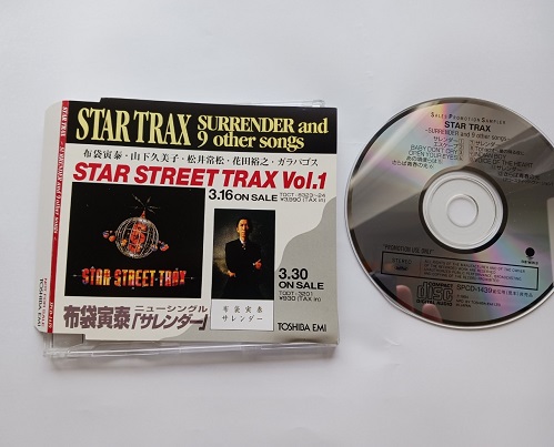 ・さんちゃんさんより画像&情報提供いただきました。ありがとうございます。 V.A.「STAR STRRET TRAX VOL.1」のプロモ用CD。2枚組から収録曲を絞って 1枚にまとめてある。花田さんは「OPEN YOUR EYES」「VOICE OF THE HEART」 の2曲を収録。 このプロモ版のタイトルが「STAR TRAX SURRENDER and 9 other songs」 となっていることから、当時の東芝EMIが強烈に布袋さんを推していたことが わかります。 (2024年5月29日追記) |