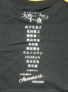 ・2022年6月18日に高崎で行われたイベント「ロックンロールスター千一夜」のTシャツ。バックに出演者一覧がプリントされている。 |