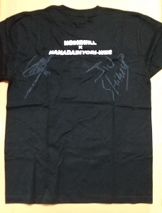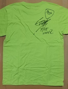 ・花田さんがTシャツの裏の柄を表に持ってくることが多い、というのは前述したが、まさにそのパターンで、しかもサインに2012年とあることから、左のTシャツもおそらくそれくらいの時期と思われる。またピックのマークも使われている。 |